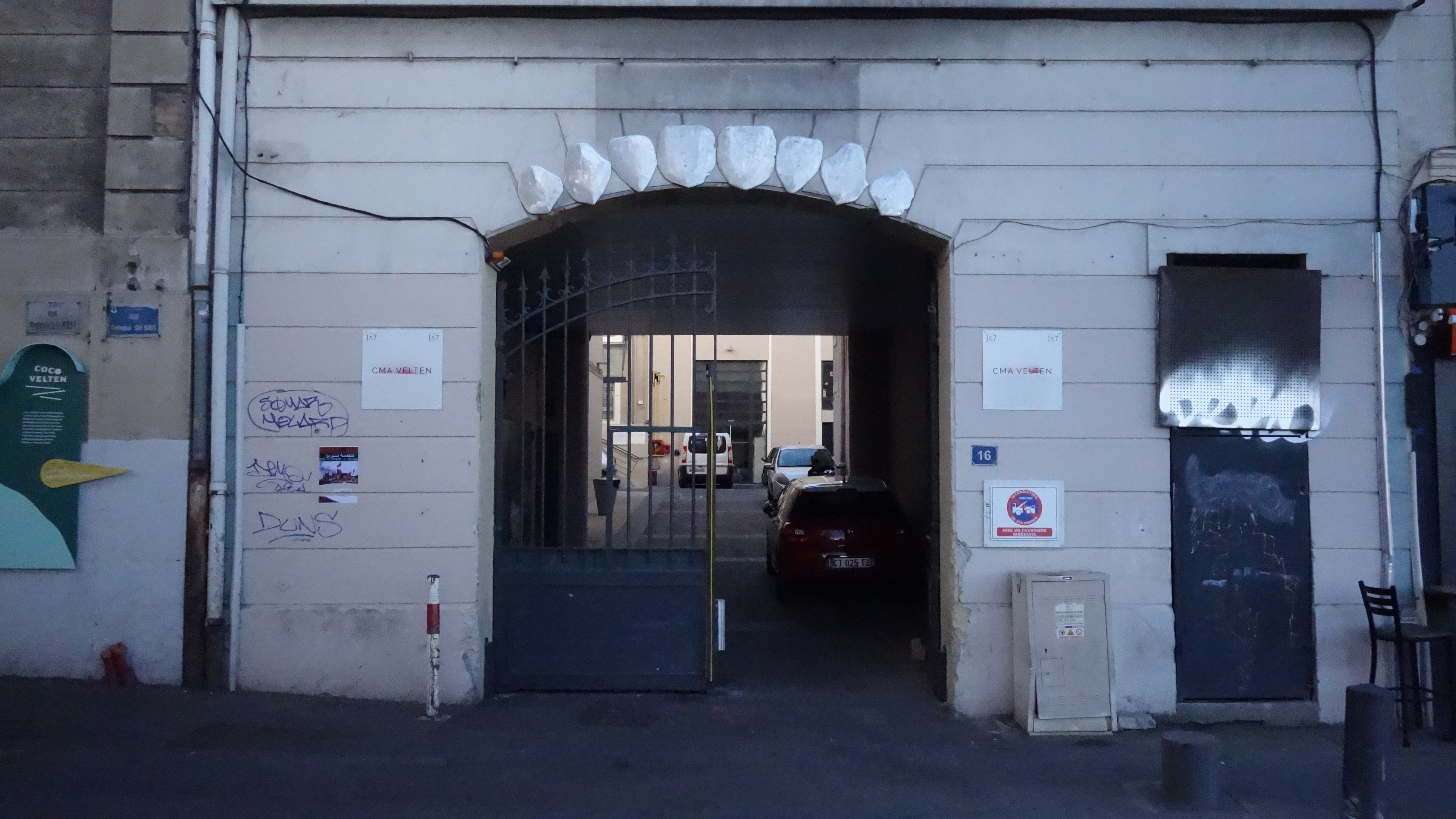 Par ailleur, ce placement symbolique ouvre le dialogue avec le quartier. L’œuvre entre en écho avec les poutrelles de soutien et les « attèles » en métal le long des immeubles vétustes, en vis a vis de l’autre coté de la place de la Porte d’Aix, que l’on peut voir à leur tour comme des « bagues d’appareil dentaire ».